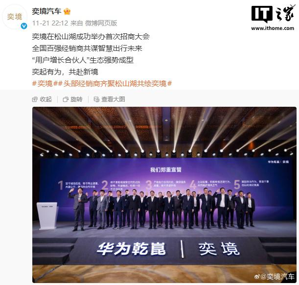 IT之家11月23日消息,在华为乾崑生态大会上,东风与华为深度合作的首款品牌——奕境正式官宣,首车将在明年亮相。11月21日,奕境汽车宣布在松山湖成功举办首次招商大会。