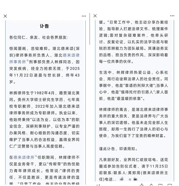 11月22日消息,据媒体报道,湖北德来颂律师事务所发布讣告,湖北德来颂(深圳)律师事务所负责人、湖北德来颂律师事务所刑事部负责人林辉因突发疾病,经全力抢救无效,于2025年11月22日凌晨与世长辞,年仅43岁。