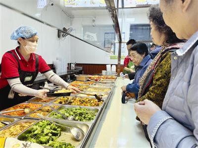 上午十点半,食堂里饭菜飘香,老人们陆续前来,熟练地找座位、聊天。67岁的王阿姨端着选好的鱼和西兰花,笑着说:“我在这儿吃了快两年,食堂变化很大,以前菜品种类少,现在每天都有很多选择。”
