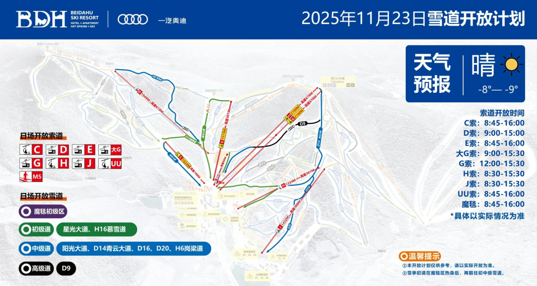 雪道:高级道为D9;中级道有阳光大道、D14青云大道、D16、D20、H6岗梁道;初级道包括星光大道、H16慕雪道,以及魔毯初级区。
