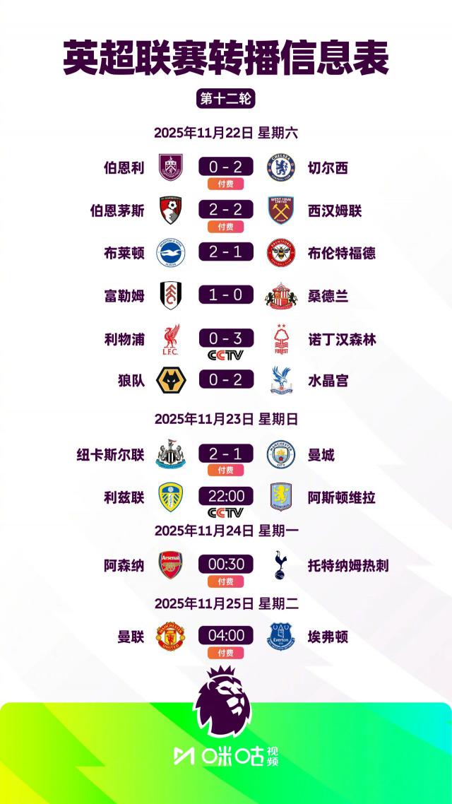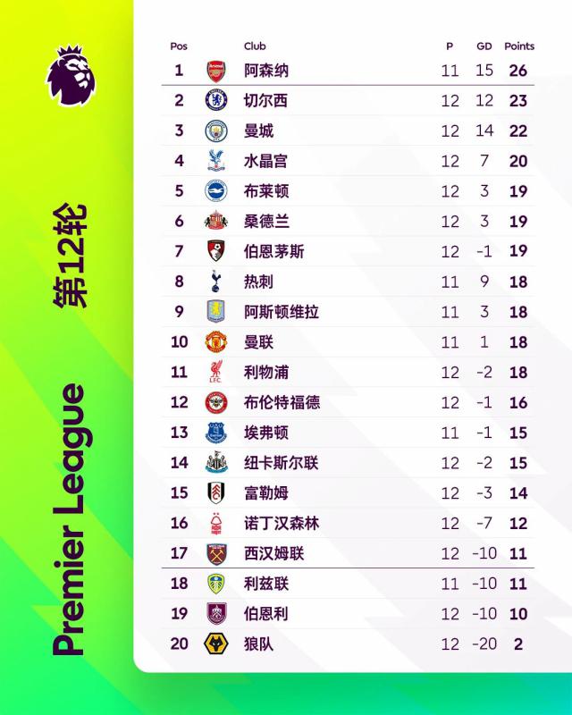 英超第12轮7场比赛全部结束,赛果如下:利物浦0 - 3诺丁汉森林、纽卡斯尔联2 - 1曼城、伯恩利0 - 2切尔西、伯恩茅斯2 - 2西汉姆联、布莱顿2 - 1布伦特福德、狼队0 - 2水晶宫、富勒姆1 - 0桑德兰。