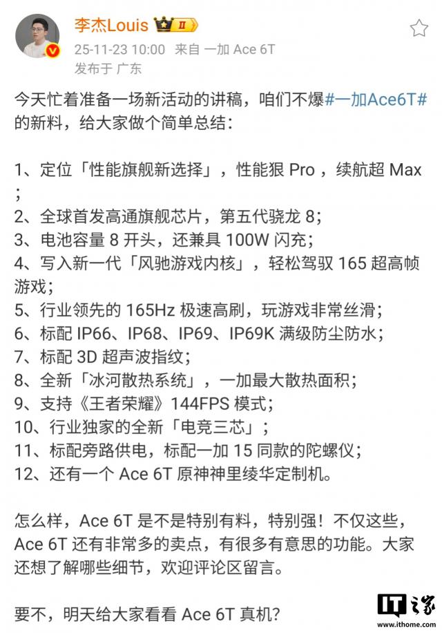 IT之家11月23日消息,一加中国区总裁李杰今日对一加Ace 6T的配置进行了简单总结,并预告真机周一见。