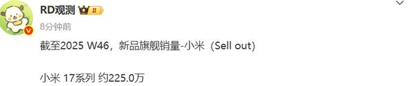 【CNMO 科技消息】11月23日,有数码博主称,截至2025第46周,小米17系列销量约达225万台。