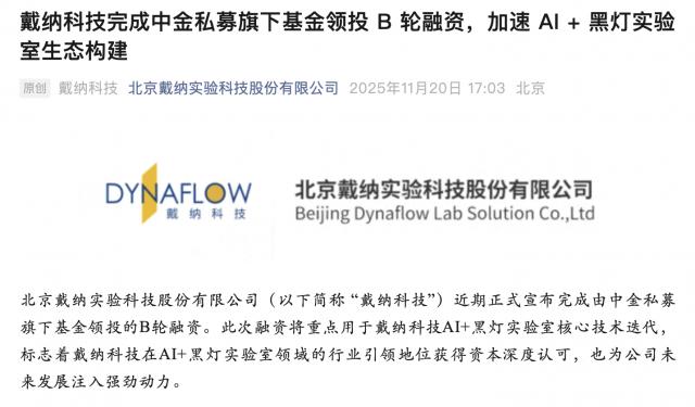 戴纳科技获B轮融资,中金私募领投助力AI+黑灯实验室生态建设