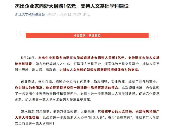 2022年匿名捐赠浙江大学1亿元。截图自公众号