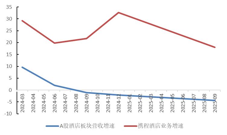 纵向比较来看,自2023年全面放开后至今,携程住宿预订业务的收入同比增速显著高于同期A股酒店板块的营收同比。