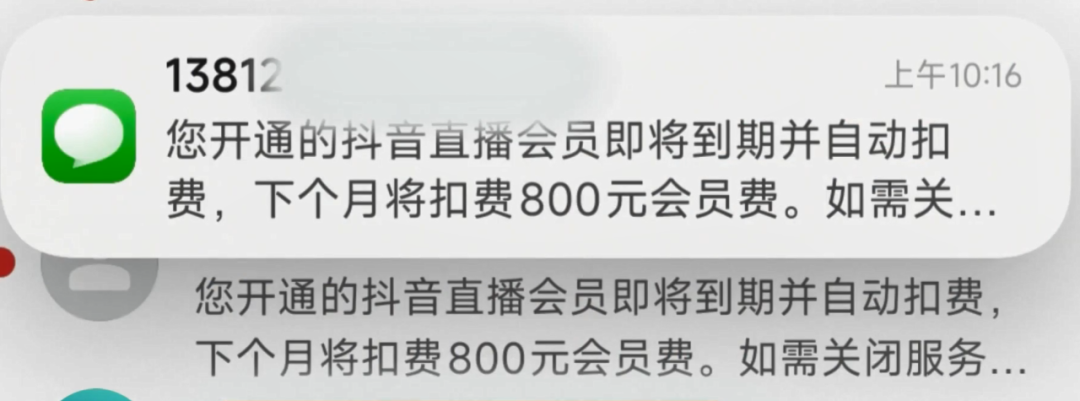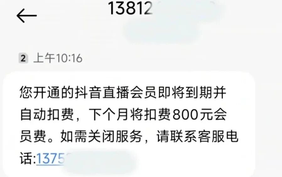 惊魂未定的邓女士这才说出经过,她收到了“抖音直播会员到期扣费”的短信。
