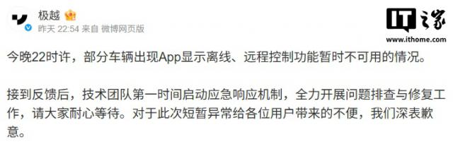 IT之家11月24日消息,昨晚22时许,极越部分车辆出现App显示离线、远程控制功能暂时不可用的情况。对此,官方进行了回应。