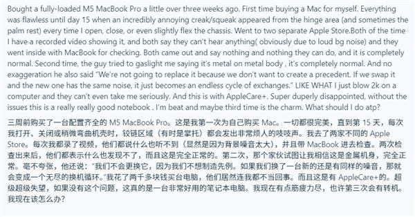 这位用户购买的是14英寸顶配M5 MacBook Pro,使用不到三周,机器就出现结构性异响。他两次前往Apple Store申请换机,均被拒绝。