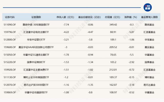 与此同时,鹏扬中债 -30年期国债ETF基金份额减少0.06亿份,对应资金净流出7.74亿元;汇添富中证电池主题ETF份额减少4.47亿份,出现资金净流出4.22亿元;华宝中证银行ETF份额减少3.80亿份,录得资金净流出3.21亿元。