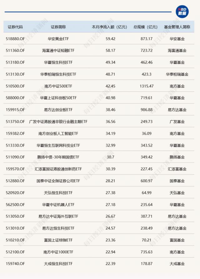 截至11月21日,本月资金净流入额居前20的ETF名单如下: