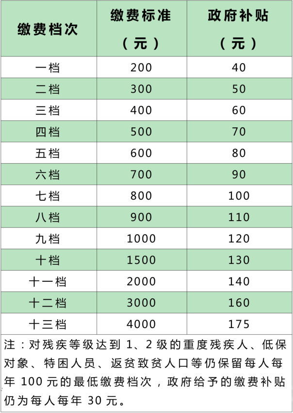 按照政策规定,我市城乡居民养老保险实行个人按年缴费、政府按档次补贴、集体自愿补助相结合原则。目前执行的缴费档次分为13个,参保人可自行选择,具体如下:
