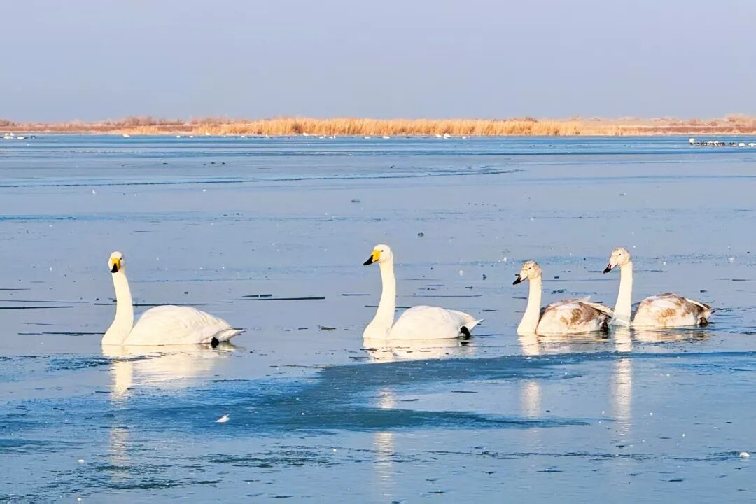 博斯腾湖,冬日的博斯腾湖湖面薄雾氤氲,天鹅舒展羽翼、嬉戏游弋,组成一幅醉人画面。