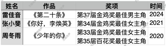 最后是以雷佳音、张小斐、周冬雨为代表的“亟待突破型”。相对来说,他们获奖后进入了一个微妙的平台期,不过实际情况各有不同。