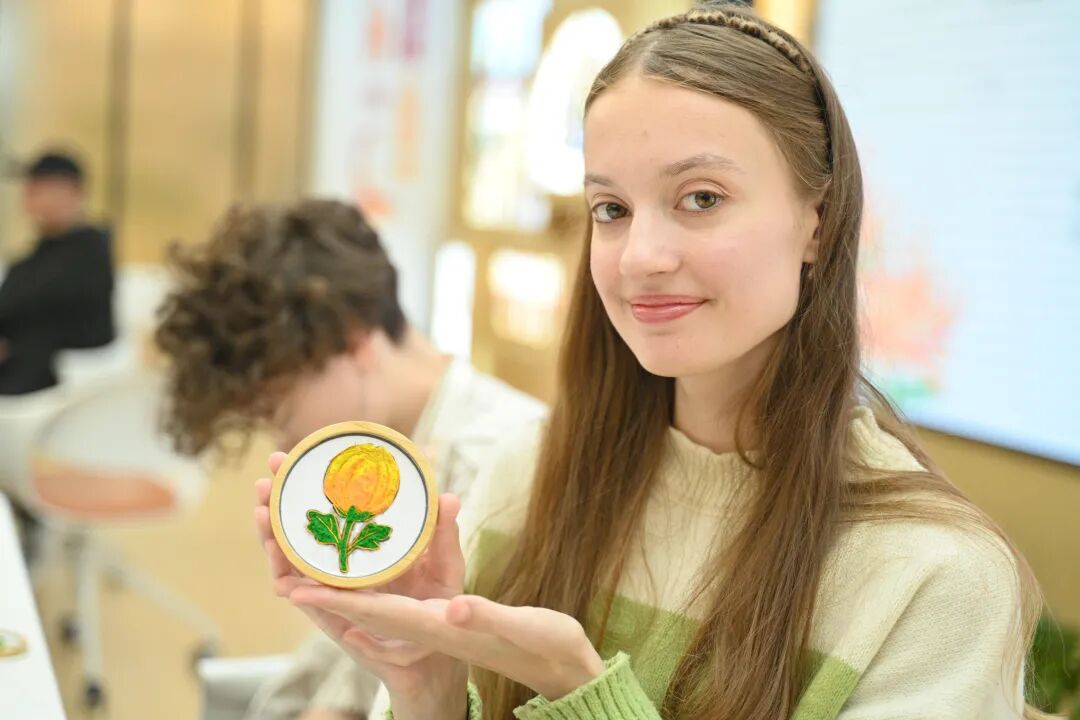之后,外籍友人前往半马苏河驿站·1690党群服务中心参观,并在那里体验了“非遗菊花掐丝珐琅杯垫”手工制作。他们用金属丝线掐出菊花轮廓,从“赏菊”深入到“创菊”。来自俄罗斯的Marina赞叹道:“这比单纯参观更有意义,让我感觉自己真正触摸到了中国非遗的一部分。”