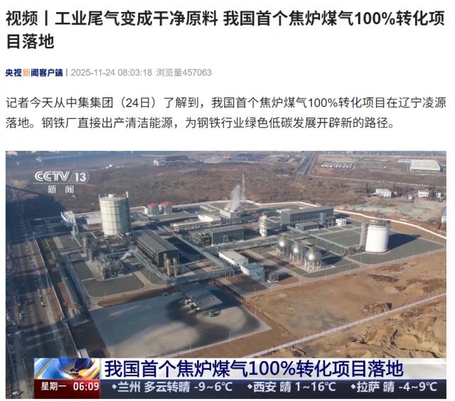我国首个焦炉煤气100%转化项目落地,工业尾气变身清洁原料