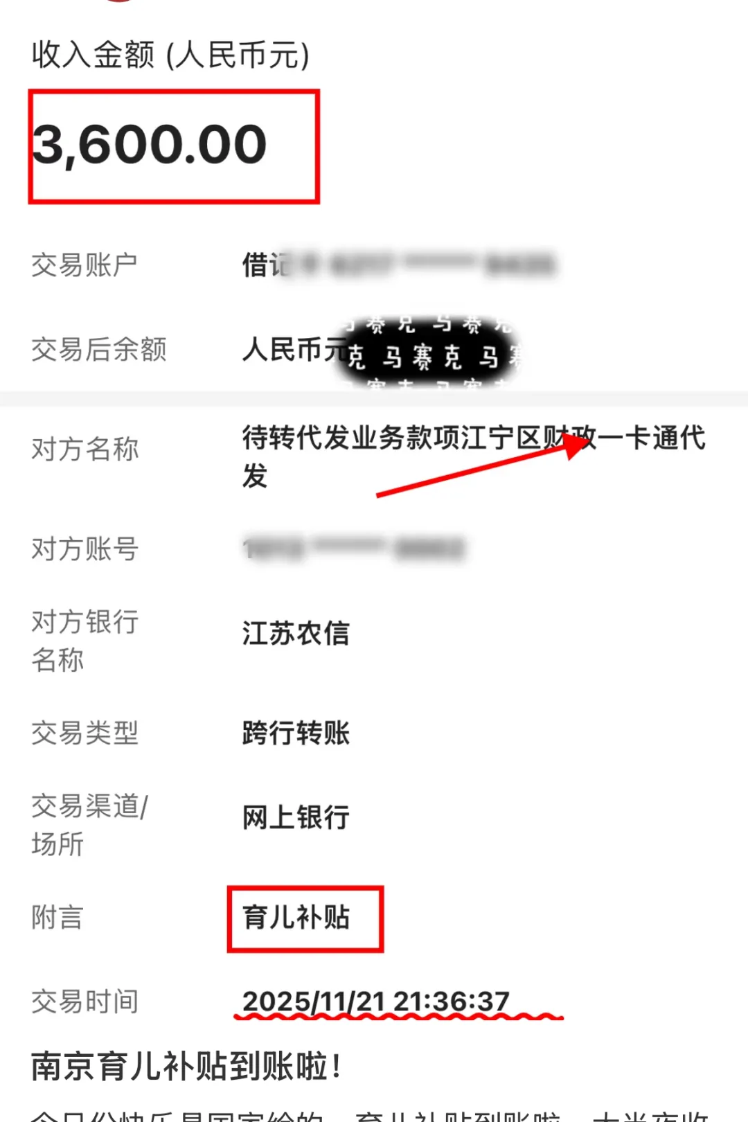 近日,不少南京市民在社交平台晒出3600元育儿补贴到账的截图。你收到了吗?