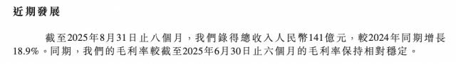 截至2025年8月31日的八个月,公司总收入达141亿元,较2024年同期增长18.9%。同期,毛利率与截至2025年6月30日的六个月相比保持相对稳定。