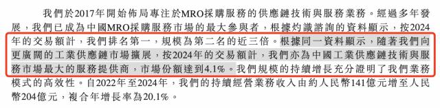 根据灼识谘询资料,按2024年交易额计算,随着公司向更广泛的工业供应链市场拓展,它已成为中国工业供应链技术与服务市场最大的服务提供商,市场份额达4.1%。