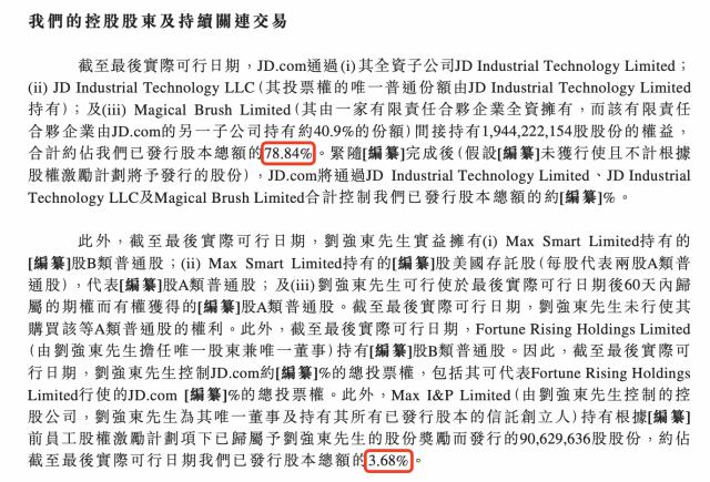 IPO前,JD.com通过其全资子公司JD Industrial Technology Limited;JD Industrial Technology LLC(其投票权的唯一普通份额由JD Industrial Technology Limited持有);及Magical Brush Limited(其由一家有限责任合伙企业全资拥有,而该有限责任合伙企业由JD.com的另一子公司持有约40.9%的份额)间接持有1,944,222,154股股份的权益,合计约占公司已发行股本总额的78.84%。