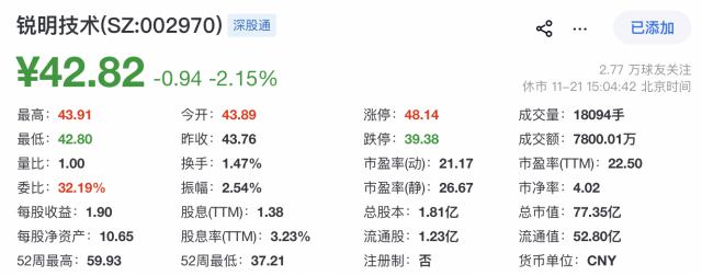 自2019年12月起,公司A股在深圳证券交易所上市,股票代码为002970。截至发稿时,锐明技术A股报42.82元,总市值约77.35亿元。