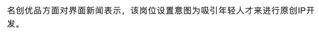 据媒体报道,名创优品表示,设置该岗位是为了吸引年轻人才参与原创IP开发。