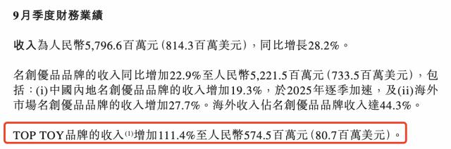 名创优品旗下TOP TOY成为本季度最大亮点,收入增加111.4%至5.75亿元。2025年前三季度,TOP TOY品牌收入增加87.9%至13.17亿元。
