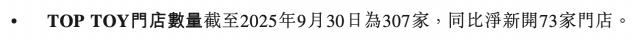 截至2025年9月30日,TOP TOY门店数量为307家,同比净新开73家门店。