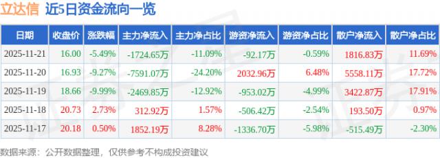 11月21日的资金流向数据显示,主力资金净流出1724.65万元,占总成交额11.09%;游资资金净流出92.17万元,占总成交额0.59%;散户资金净流入1816.83万元,占总成交额11.69%。
