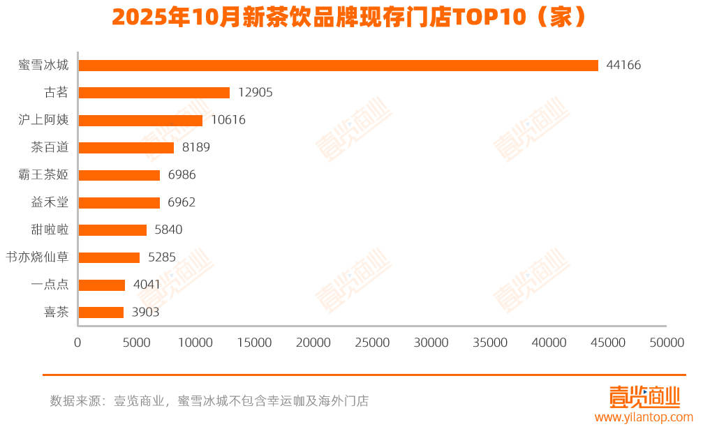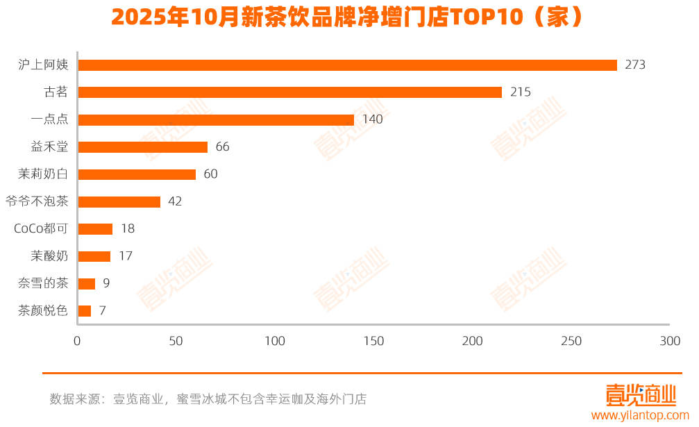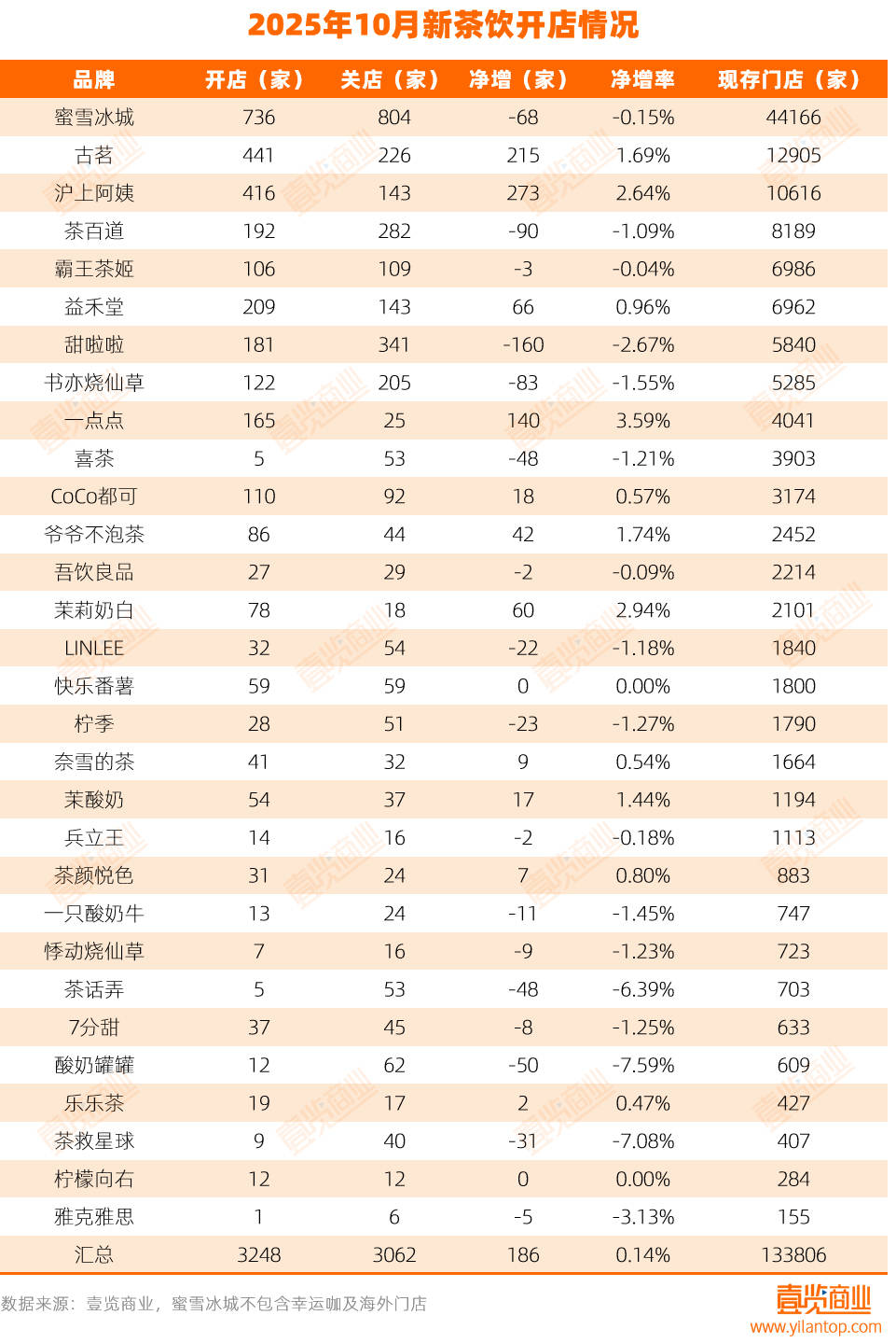 2025年10月,新茶饮行业整体拓店节奏放缓。壹览商业监测的30个连锁品牌合计现有门店总量13.38万家,单月新开3247家、关闭3062家,净增长186家,环比增长0.14%。