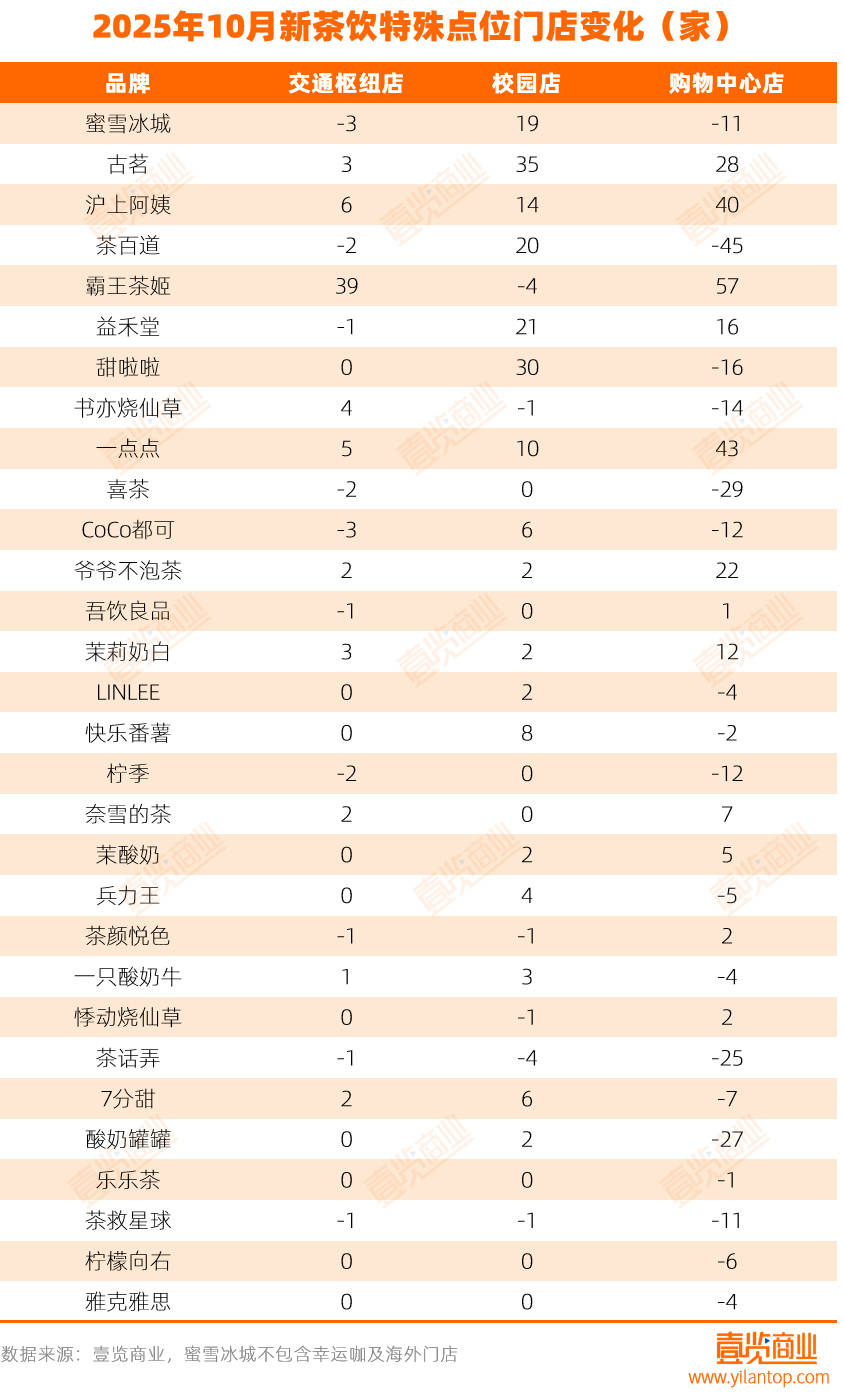 从特殊点位看,校园成为品牌扩张的主战场。古茗当月净增35家校园店;甜啦啦净增30家;茶百道、蜜雪冰城和益禾堂分别净增20家、19家和21家,五大品牌在校园渠道的净增总数达到125家,占10月校园店总增量的71.84%。