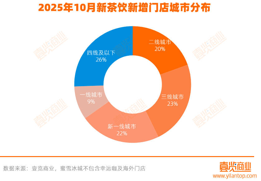 从城市分布来看,二三线和新一线城市成为扩张的主阵地,合计占比达65.1%。其中,三线城市以754家新增门店位居首位,占比23.2%。相比之下,一线城市仅新增302家,占比9.3%;显示出新茶饮品牌在下沉市场的持续渗透。