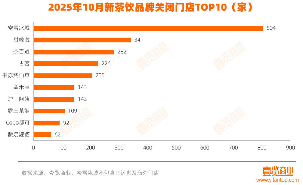 品牌在快速扩张同时,也伴随着大量闭店。蜜雪冰城以804家的闭店数量位居首位;其次为甜啦啦,闭店341家,古茗关闭226家;茶百道关闭282家。