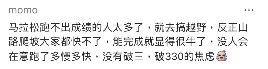 除了赛道和赛制的差别,对成绩和配速的担忧,也是让越来越多跑步新手选择越野跑的原因之一。