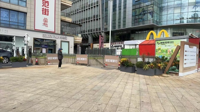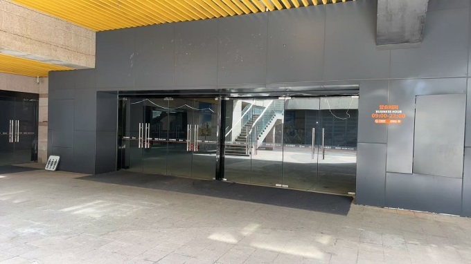 原超市一楼地面入口处被围栏遮挡,看不到朴朴超市入驻的相关图文信息和品牌标识。经与商场工作人员确认,朴朴超市已租下该店面,但装修未启动,正式开业还需时间。