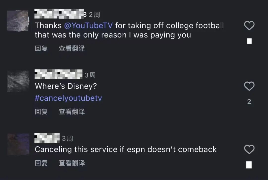 因此,“黑屏”让YouTube TV更为着急。从10月30日起,用户无法观看ESPN上的大学橄榄球黄金档赛事,还错过了NFL重磅的“周一夜赛”,引发大量投诉。许多网友涌入YouTube TV官方账号要求恢复频道,甚至发起了#cancelyoutubetv话题。