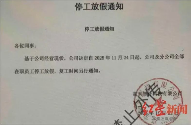 11月24日,据红星资本局消息,智驾公司毫末智行科技有限公司(以下简称“毫末智行”)突然传出停摆的消息。多名毫末智行员工称,11月22日下午,毫末智行公司大群突然发布了一则“停工放假通知”,表示基于公司经营现状,决定自11月24日起,公司及分公司全部在职员工停工放假,复工时间另行通知。