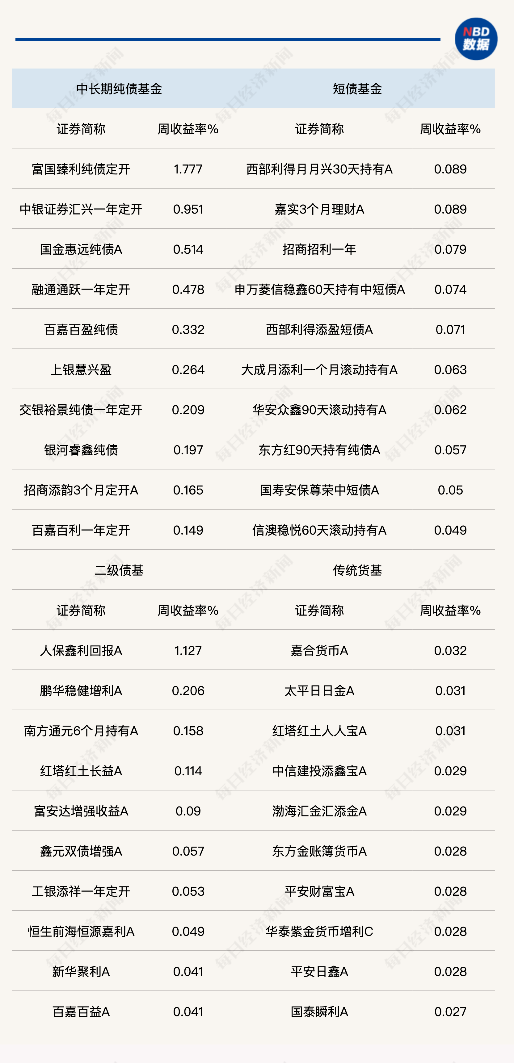 这从纯债基金的收益率就能体现出来。Wind统计显示,上周中长期纯债基金和短债基金的平均收益率均为0.02%,较前一周有所下降。在头部产品业绩方面,富国臻利纯债定开的周收益率达1.78%,人保鑫利回报达1.13%,其余产品均在1%以下。