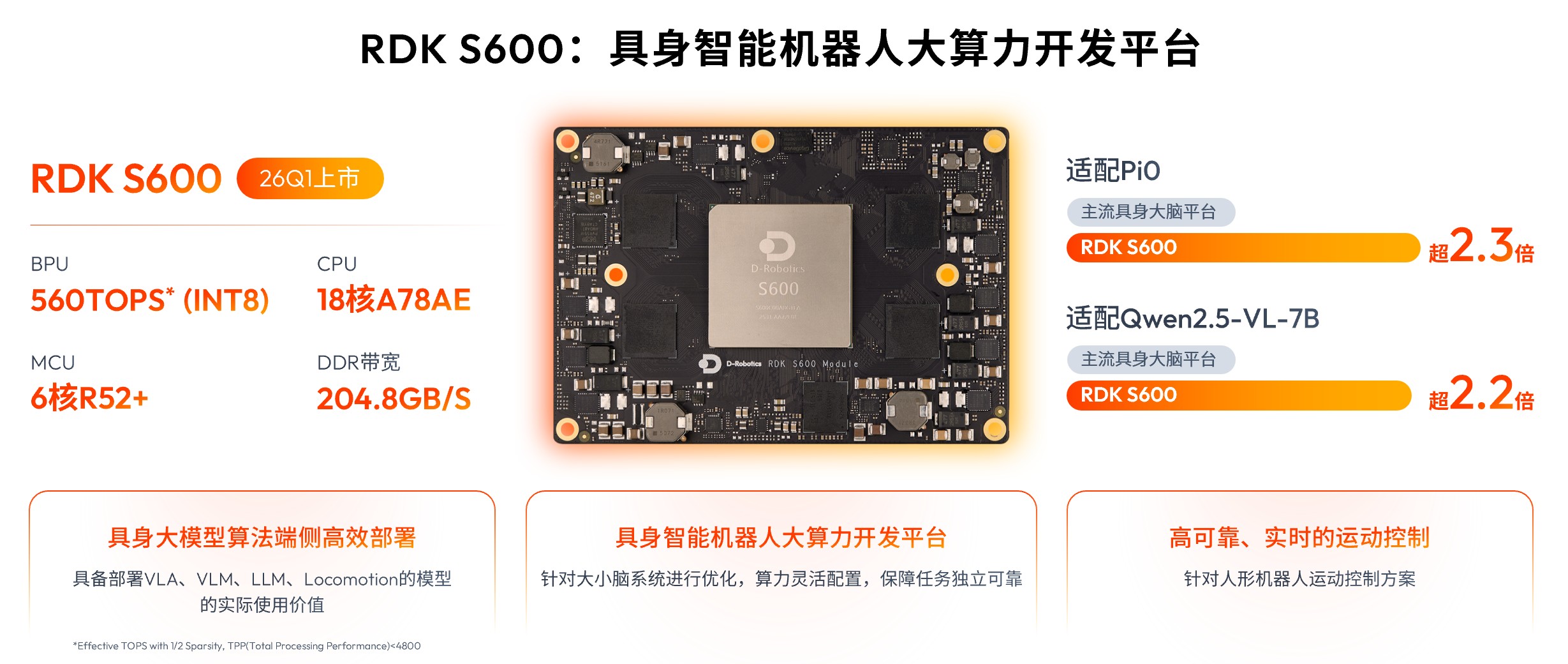此次前瞻亮相的S600作为地瓜机器人的旗舰级具身智能机器人大算力开发平台,拥有560 TOPS*(INT8) 算力,采用高效灵活的大小脑架构设计并进行了深度优化。其大脑配置18核A78AE CPU和全新BPU Nash,可支持VLA、VLM、LLM、Locomotion多种具身大模型算法端侧高效部署,尤其是在适配Pi0、Qwen2.5 - VL - 7B时,性能分别超越主流具身大脑平台2.3倍和2.2倍,满足复杂决策需求;小脑配置6核R52 + MCU,专为人形机器人优化,具备高可靠、实时的运动控制能力。
