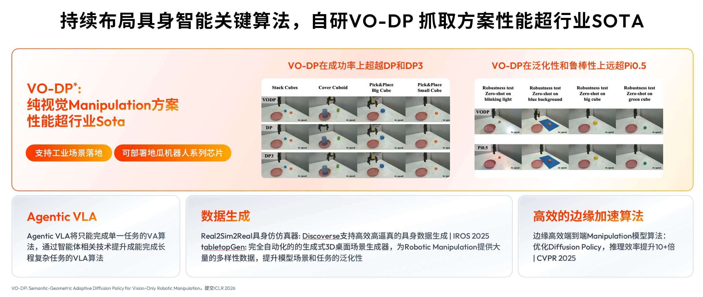 地瓜机器人在前沿算法领域亦不断创新,与端侧智能计算平台软硬结合,帮助客户和开发者实现先进算法在端侧的高效部署。例如,地瓜机器人自研的双目算法SOTA指标行业领先,以精度媲美激光雷达的双目Depth、避障性能达到智能驾驶级别的双目OCC、业界首个多双目全景Occupancy感知方案高阶段Omni - OCC方案,持续赋能机器人客户产品落地。地瓜机器人持续布局具身智能关键算法,自研的VO - DP纯视觉Manipulation抓取方案性能超行业SOTA,成功率超越DP和DP3、泛化性和鲁棒性远超Pi0.5,达到工业场景的应用要求。