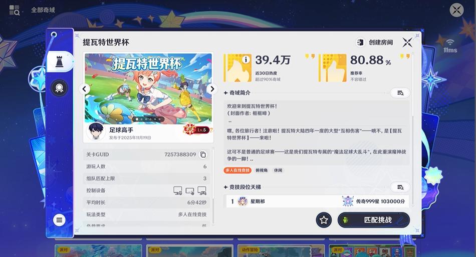 《提瓦特世界杯》热度高达39.4万,玩家好评率80.9%,玩法是3v3团队足球赛,每局限时7分钟。其乐趣在于,根据角色技能选择、团队配合以及个人操作等因素,对局结果会有所不同。如果双方队伍实力较弱,可能会出现谁持球谁被围殴的搞笑场景;高手对决时则会上演精彩配合或个人秀。总之,放平心态、享受游戏,就能在欢声笑语中打发不少时间。