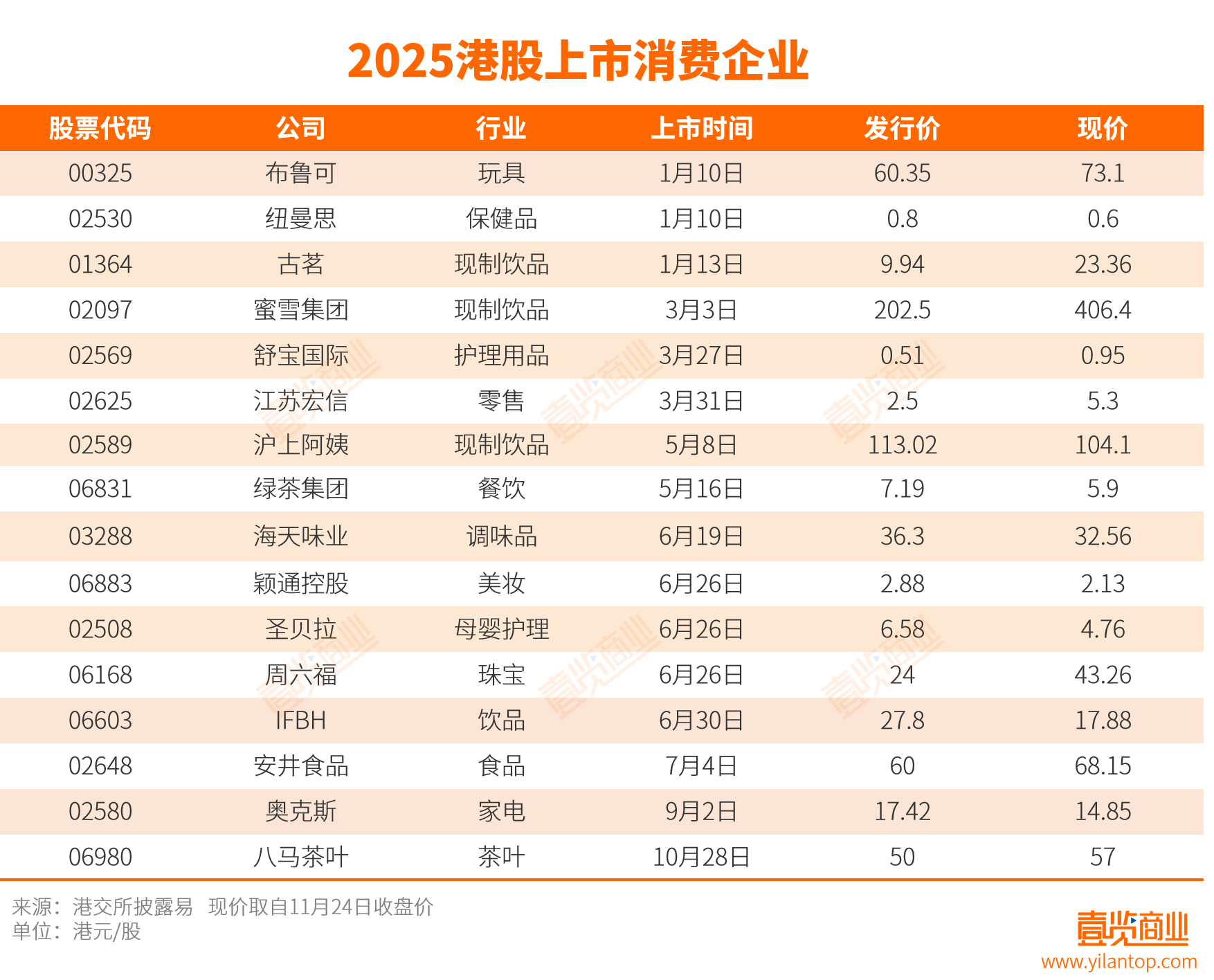 普华永道数据显示,2025年上半年港股新上市公司中,零售、消费品及服务类占比高达34%。据壹览商业不完全统计,从年初至10月底,至少15家消费类企业成功在港交所上市,涉及饮品、食品、母婴个护、调味品、餐饮零售等多个细分行业。
