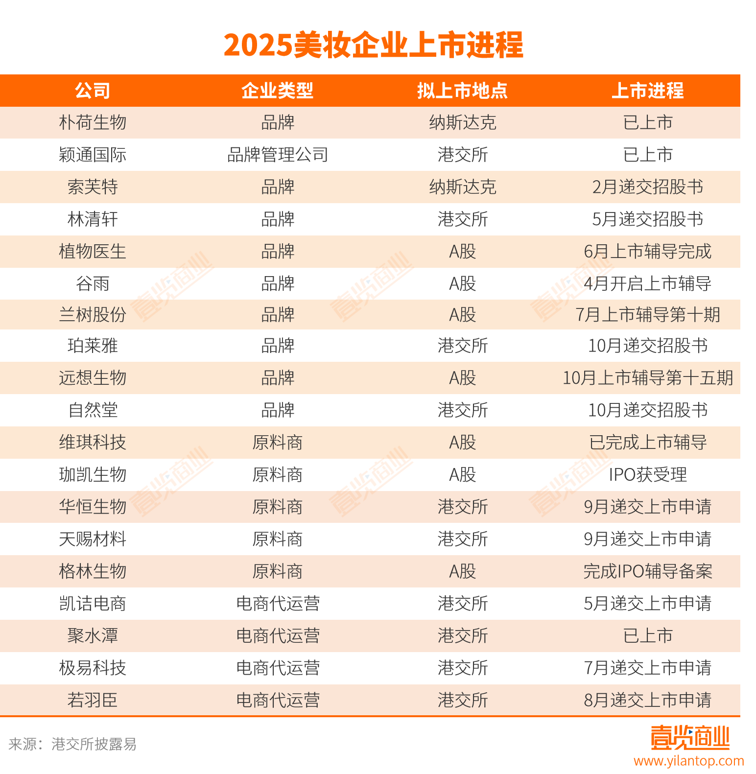 壹览商业统计发现,2025年以来,20家国货美妆相关企业启动上市进程,包括品牌方、原料供应商、电商代运营公司等。其中,约一半企业选择港交所作为主要申报地,其余则前往A股或美股市场。