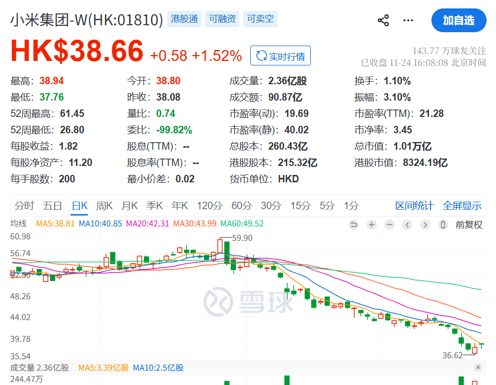11月24日晚间,小米集团发布公告,公司创始人、执行董事、董事长、首席执行官兼控股股东雷军于2025年11月24日通过其全资拥有的Team Guide Limited购入260万股本公司B类普通股,平均价为每股约38.58港元,雷军持股比例增加至23.26%。