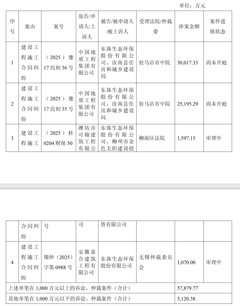 关于新增其他尚未披露的诉讼、仲裁事项,公告指出,自公司前期于2025年7月2日发布《东珠生态环保股份有限公司关于累计涉及诉讼、仲裁事项的公告》至本公告披露之日,公司及控股子公司尚未披露的诉讼、仲裁案件共计16件,累计涉案金额为6.3亿元。