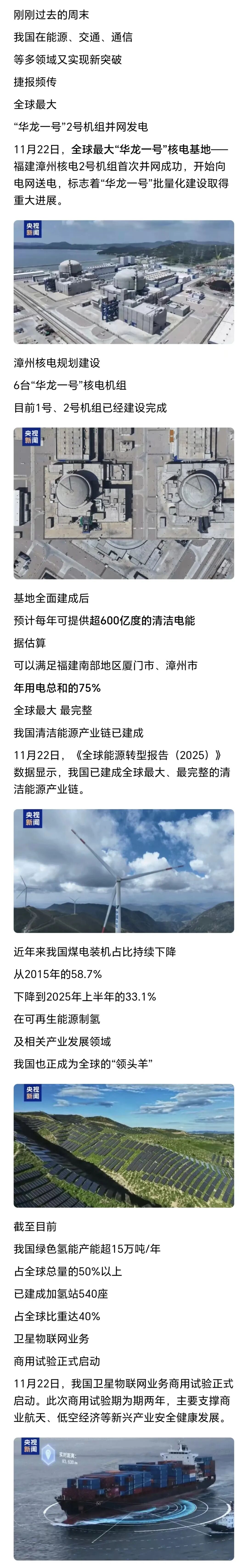 刚刚过去的周末,我国在能源、交通、通信等领域捷报频传,核电、清洁能源、桥梁工程、电池技术及卫星通信等方面均有新突破,彰显“中国智造”硬实力,为全球可持续发展提供技术范本。