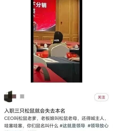 据经视直播报道,近日有网友发帖称,入职三只松鼠后员工需将名字改为“鼠某某”。记者就此联系三只松鼠股份有限公司,工作人员回应表示,公司内部确实存在这一做法。