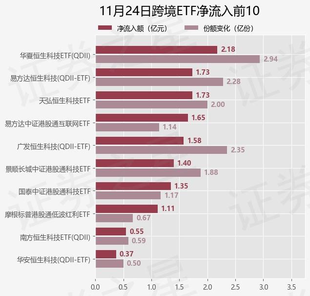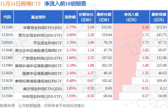 当日,在所有跨境ETF基金中,有44只获得资金净流入。其中,华夏恒生科技ETF(QDII)(513180)表现突出,占据净流入首位,其份额增加了2.94亿份,对应的净流入额为2.18亿元。
