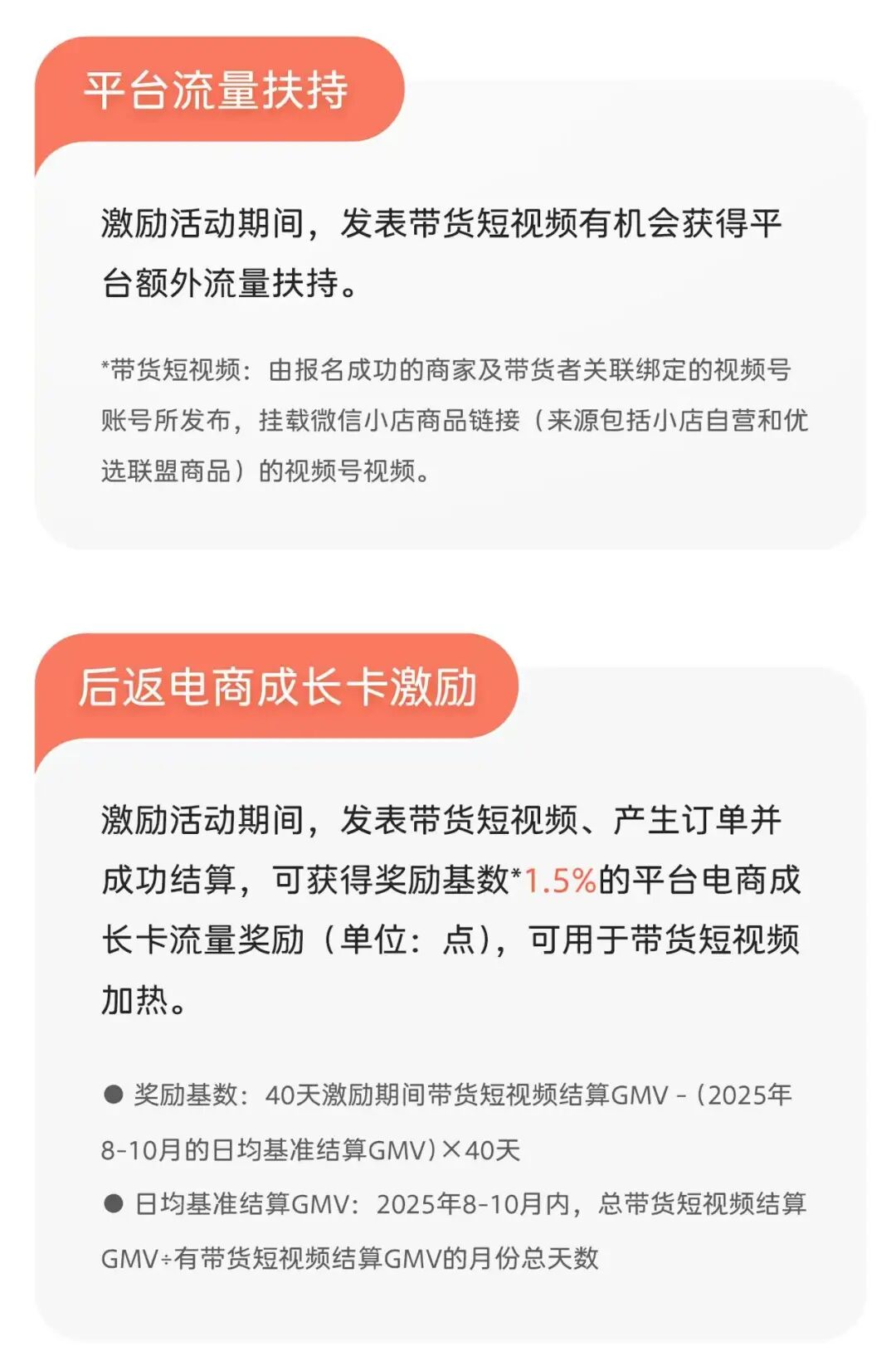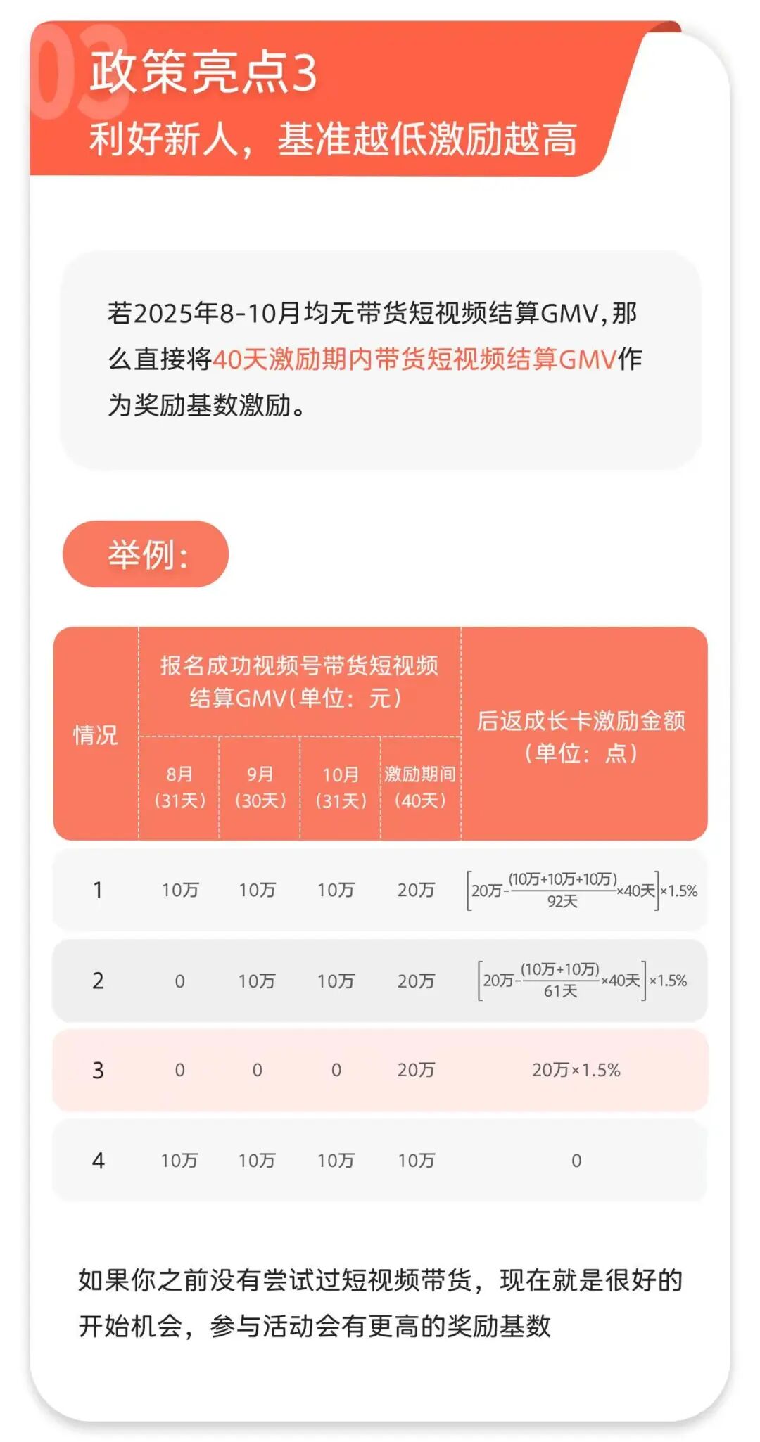 其二,通过低门槛吸引新入场者,加速赛道增长。激励计划几乎无额外门槛,不限制店铺评分或等级,核心条件仅为视频号账号开通短视频带货功能。从增量返还的奖励设计来看,新入场且增长迅速的商家更易获得高奖励,平台以此拉动更多参与者,做大短视频带货体量,构建“直播负责爆发,短视频负责日常和长尾”的双增长曲线。