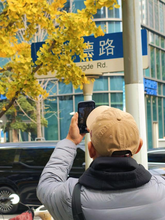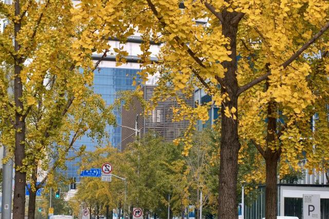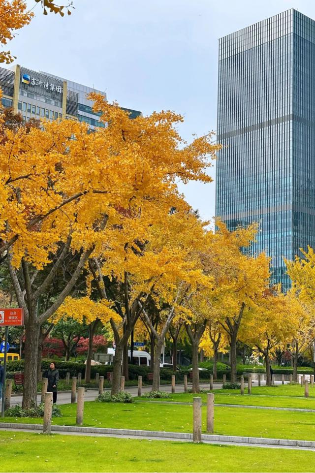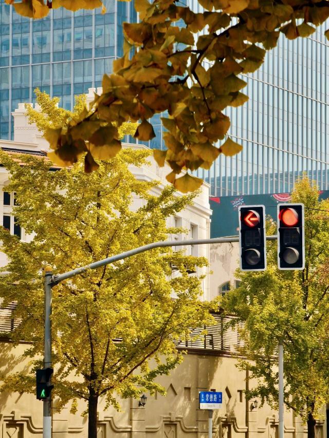 抬头望去,银杏枝条交织成金色画框,将摩登街景、流动的车流人群巧妙框入其中,每一眼都似精心绘制的都市油画。